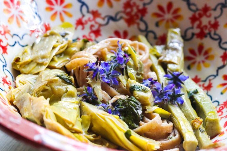 mit Bio-Emmer-Einkorn, buntem Gemüse und frischen Kräutern,